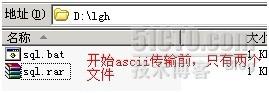 環境說明:192.168.133.34上有一FTP服務器端(windows版),FTP用戶名為lgh,密碼為www.jb51.net。該用戶的根目錄為D:\lgh。里面文件見下圖。sql.rar是sql.bat的壓縮文件,大家注意看圖,我等下會在后面的實例中引用這個文件,把mget,get,prompt,bin,ascii等ftp命令詮釋得一清二白。