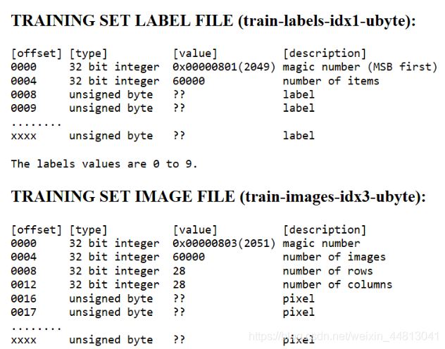 上圖是訓練集的label和image數據的存儲格式。兩個文件最開始都有magic number和number of images/items兩個數據,有用的是第二個,表示文件中存儲的樣本個數。另外要注意的是數據的位數,有32位整型和8位整型兩種。