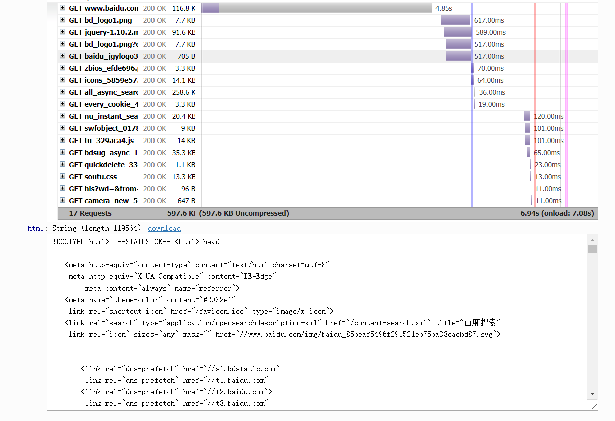 上面有個輸入框,默認是http://google.com,我們可以換成想要渲染的網頁如:https://www.baidu.com然后點擊Render me按鈕開始渲染,頁面返回結果包括渲染截圖、HAR加載統計數據、網頁源代碼: