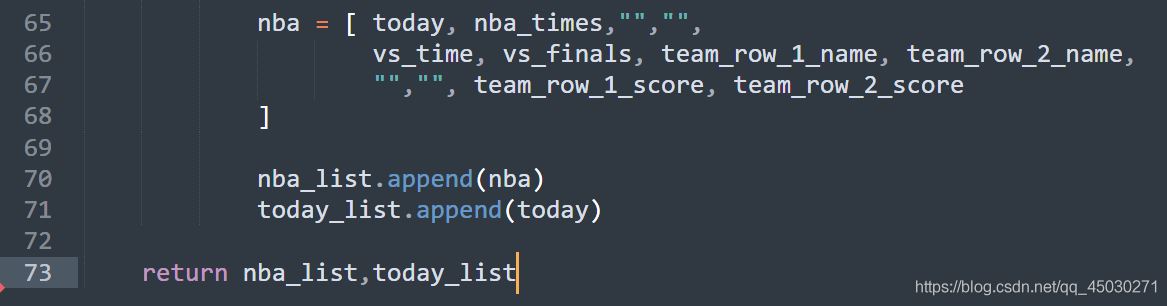 獲取比賽的相關分數后,我們創建兩個列表,一個列表定義我們等一下需要用到NBA的樣式,另一個列表則存儲今天的日期,最后返回