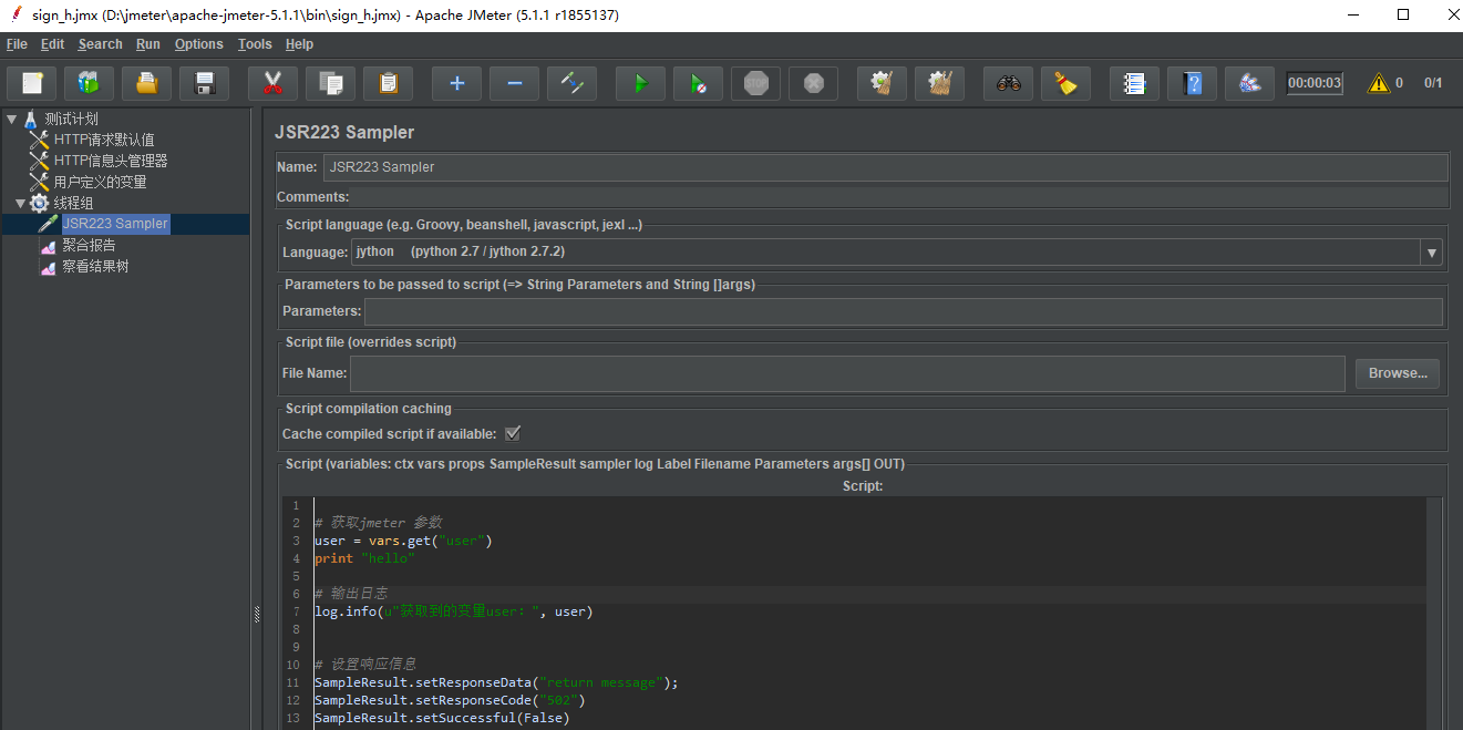 前面在 BeanShell 里面是通過 java 腳本實現請求的預處理,jmeter里面也可以調用python的腳本,需安裝 jython.jar 的插件.