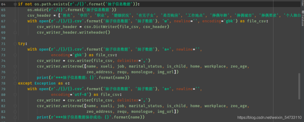 with open(r'./{}/{}.csv'.format('妹子信息數據', '妹子數據'), 'w', newline='', encoding='gbk') as file_csv: