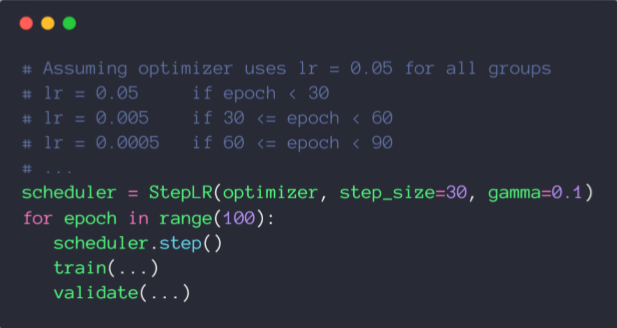 torch.optim.lr_scheduler.StepLR(optimizer, step_size, gamma=0.1, last_epoch=-1)