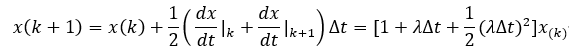 #改進(jìn)歐拉法疊加量 y_dere2 = -20*x(k) + 0.5*400*delta_t*x(k)