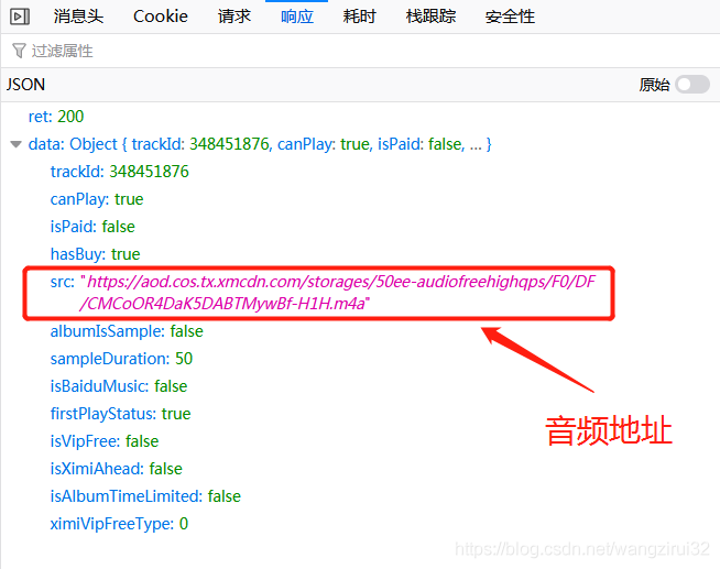 查看它的響應(yīng)信息,發(fā)現(xiàn)音頻地址就在里面: