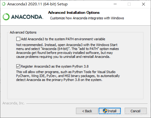 Not recommended.Instead , open Anaconda3 with the Windows startmenu and select “Anaconda (64-bit)”. This “add to PATH” option makesAnaconda get found before previously installed software, but maycause problems requiring you to uninstall and reinstall Anaconda.