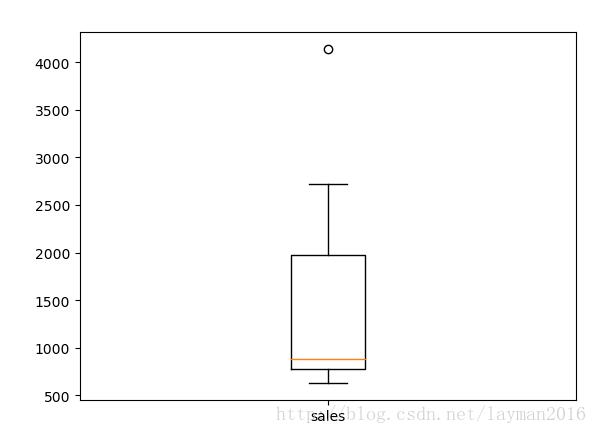 使用pandas畫箱型圖簡單方便,但是注釋比較麻煩,可以用annotate添加異常點的注釋。若使用之前的數據va,則先創建二維數據框再畫圖。如果有多個列為數字類型,那么可以畫每個列的箱型圖,這里只有一列數據,如下: