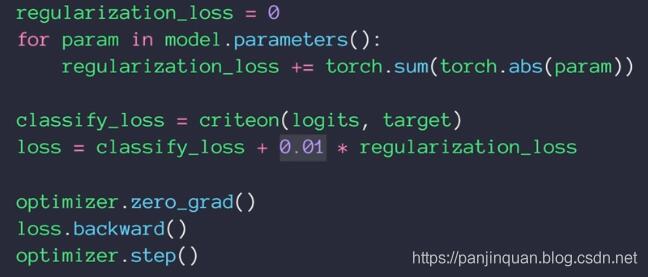 (2)缺點:torch.optim的優化器固定實現L2正則化,不能實現L1正則化。如果需要L1正則化,可如下實現: