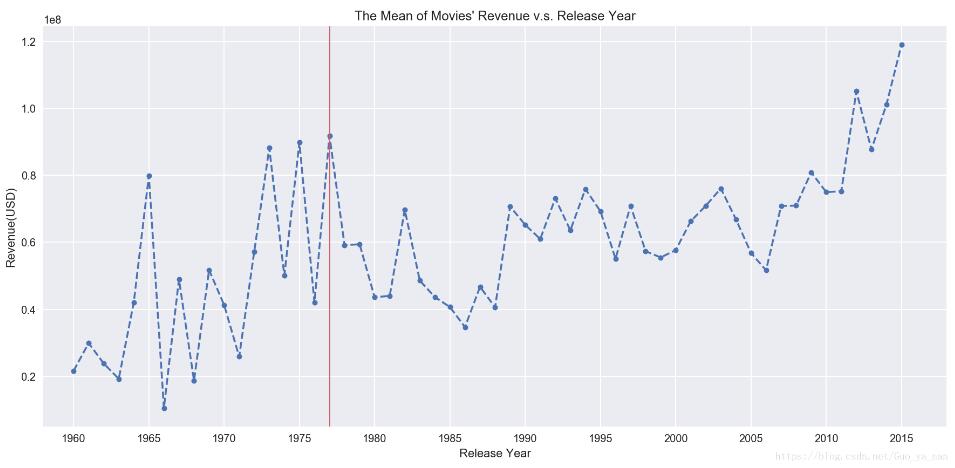 ax.set_title('The Mean of Movies' Revenue v.s. Release Year')