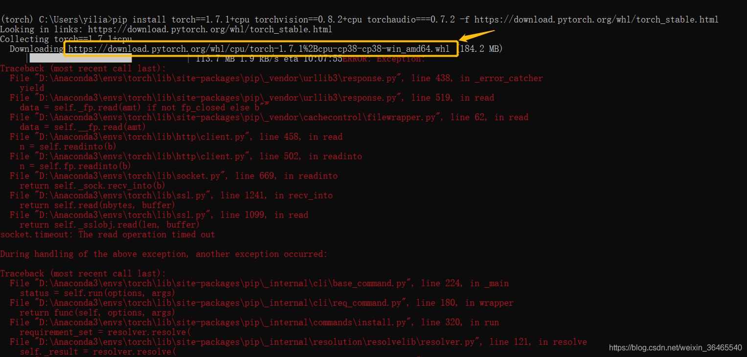 這里我直接將上面從官網得到的命令粘貼到了Anaconda Prompt中,但是下載了一半出錯了。大家在這里可以不用等它下載完,出現下圖黃框圈起來的鏈接后就可以直接復制粘貼到瀏覽器進行下載,速度超快噠!大家記得避開我這個雷!