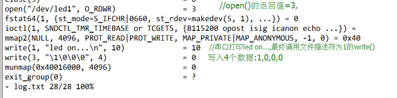 # strace -o log.txt ./led_text led1 on