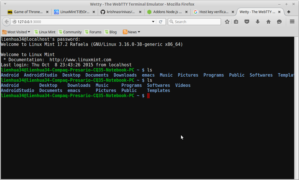然后打開瀏覽器,輸入http://127.0.0.1:3000,然后輸入密碼登陸成功后便可以進行命令行操作了,效果如下圖所示,