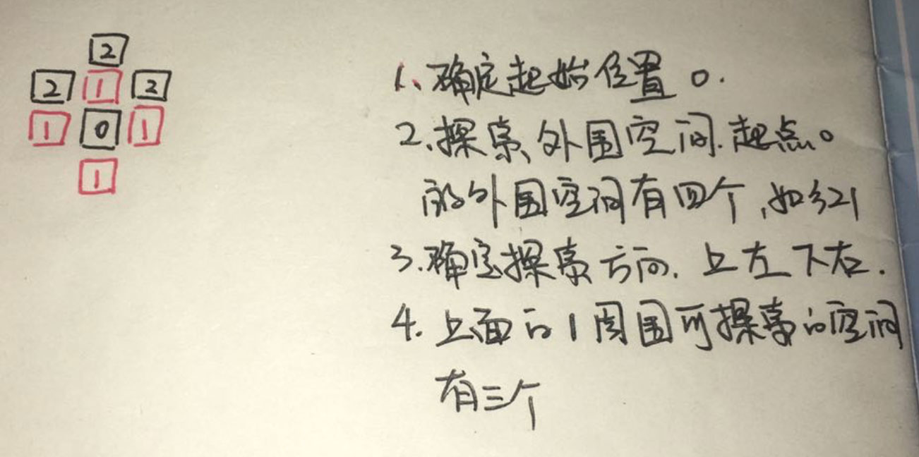 第一步, 我們先明確起點. 這個起點有上下左右四個方向可以探索. 我們按照順時針順序探索, 上 左 下 右