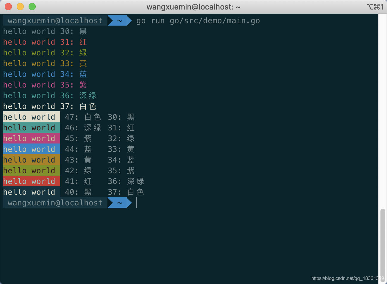 fmt.Printf("\x1b[%d;%dmhello world \x1b[0m 41: 紅 36: 深綠 \n", 41, 36)