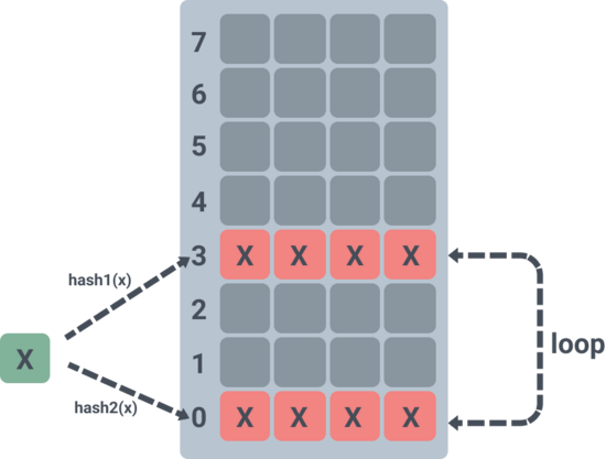 上圖展示了元素 X 在插入到 hash 表的時候,hash 兩次發(fā)現(xiàn)對應的槽位 0 和 3 都已經(jīng)滿了,那么隨機搶占了槽位 3 其中一個元素,被搶占的元素重新 hash 之后插入到槽位 5 的第三個位置上。
