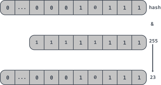 假如初始化傳入的 capacity 是1024,那么計算到 bucketPow 是 8,對應取到 masks[8] = (1 8) - 1 結果是 255 ,二進制是 1111,1111 ,和 hash 的高 32 取與 得到最后 buckets 中的槽位 i1 :