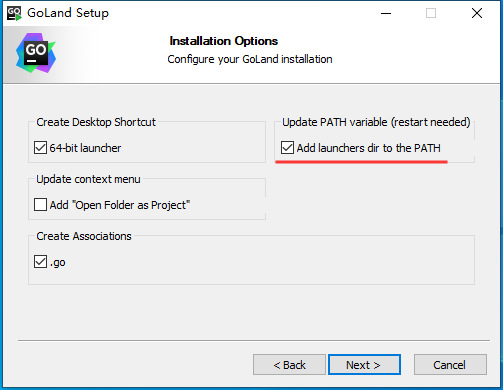 點擊Next, 選擇要創建桌面快捷方式, 并關聯.go文件, 并添加到PATH.