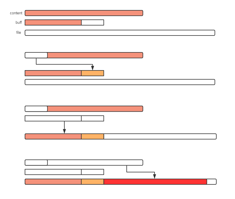 - 如果p的剩余內容依舊大于緩沖區,(注意此時緩沖區是空的,情況和步驟2一樣)則把p的剩余內容直接寫入文件