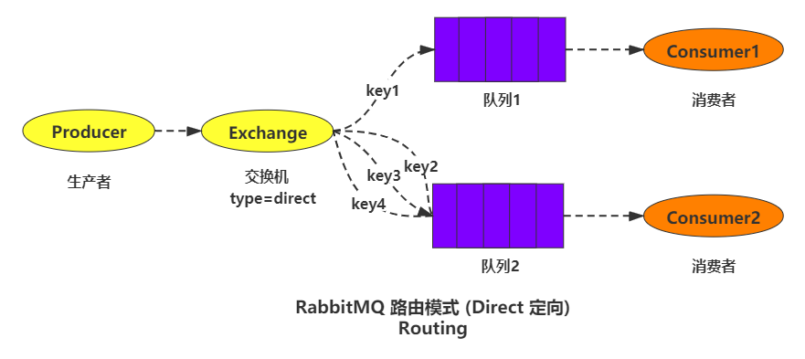 路由模式的交換機類型是 direct,與 fanout 模式相比,多了路由 key 這個概念。生產者發送攜帶指定 routingKey(路由key) 的消息到交換機,交換機拿著此 routingKey 去找到綁定了這個 routingKey 的隊列,然后發送到此隊列,一個隊列可以綁定多個 routingKey 。