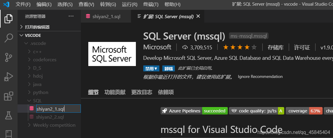 首先我們要在Vscode商城里面下載一個插件:MSSQL。