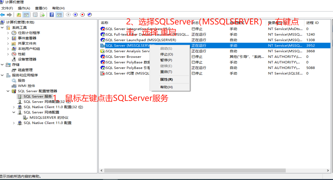 8、找到SQLServer(MSSQLSERVER)服務-》右鍵點擊-》選擇重啟-》等待重啟完成。