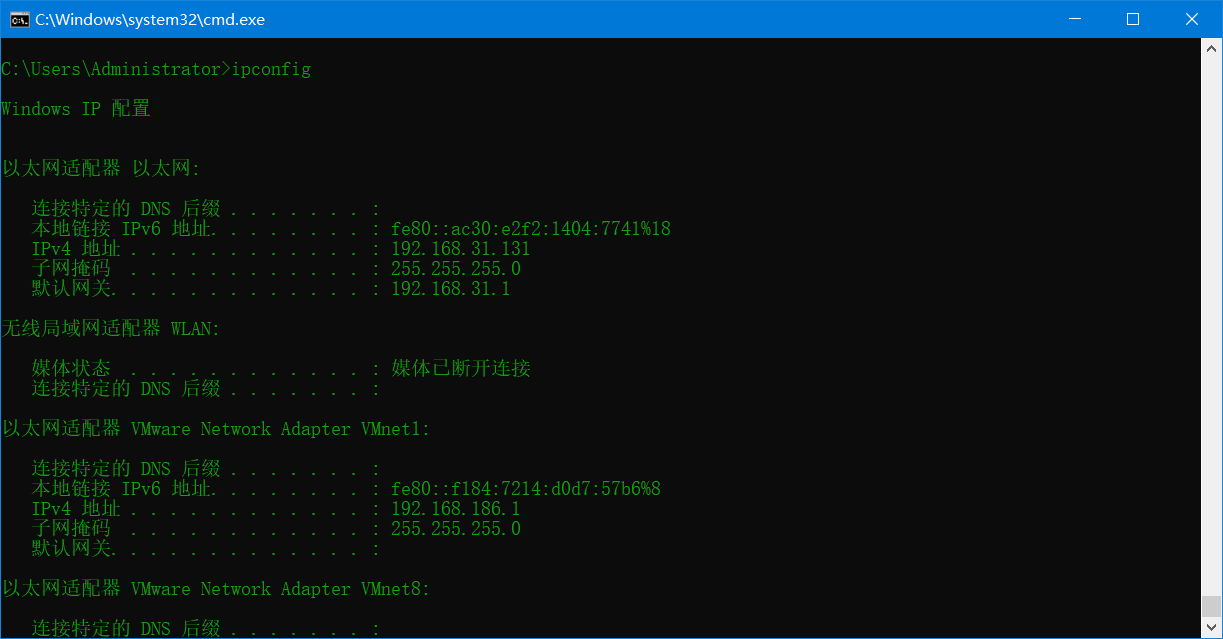 9、在dos命令窗口中輸入ipconfig命令查看本機ip。