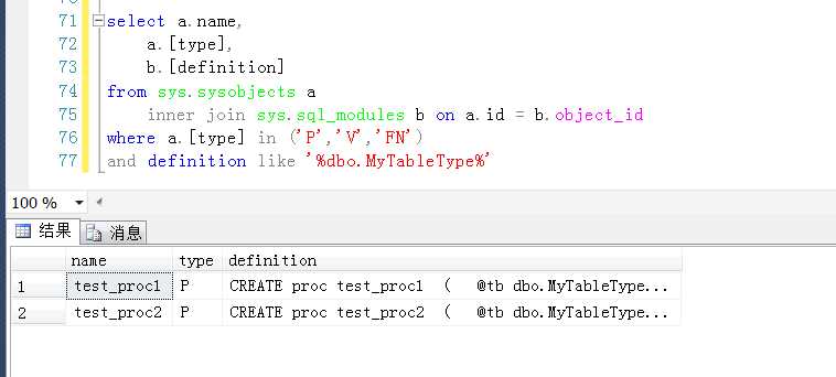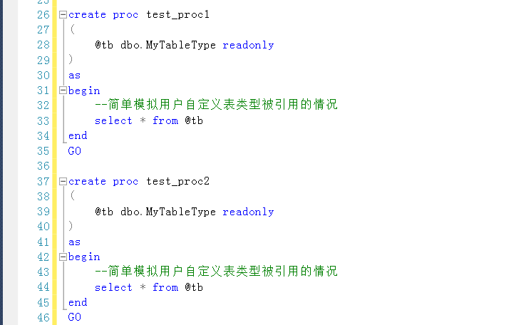創建兩個存儲過程,分別用到了上面定義的用戶自定義表類型,模擬用戶自定義表類型被引用的情況
