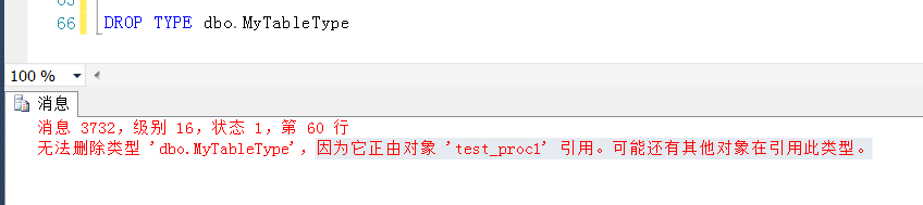 那么只能通過刪除TableType的方法來重建這個TableType,當刪除的時候,仍然報錯,提示“因為它正由對象 '***' 引用。可能還有其他對象在引用此類型。”