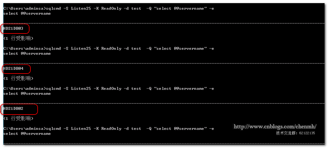 當HD21DB01作為主節點時,HD21DB02,HD21DB03,HD21DB04平均分攤讀的壓力,當HD21DB02,HD21DB03,HD21DB04都無法訪問時讀連接訪問HD21DB01;演示如下: