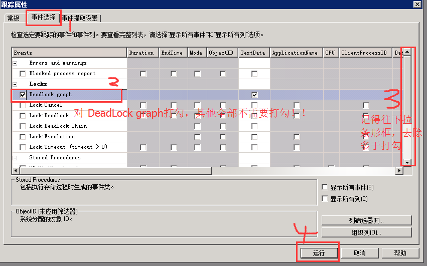 接著填寫事件選擇>項,只需要選擇 deadlock graph> Events,其他都不需要打勾,最后點擊運行就可以開始監控了。
