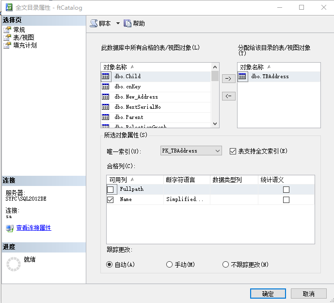 Note: 在Name列上創建全文索引使用的語言是簡體中文(Simplified Chinese)