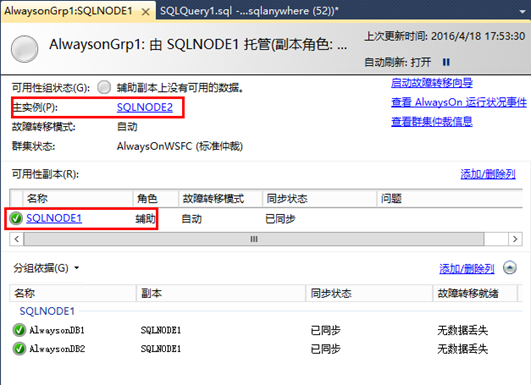 當前讀寫節點為SQLNODE2,直接將SQLNODE2 sqlserver服務重啟,可用組會自動漂移到SQLNODE1。截圖略。