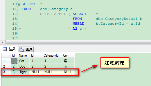 由上圖可看出OUTER APPLY把左表中的信息查出后把右表中的信息也關聯出來了,當然當右表的信息為空(NULL)時,OUTER APPLY也會在結果集中顯示出來.