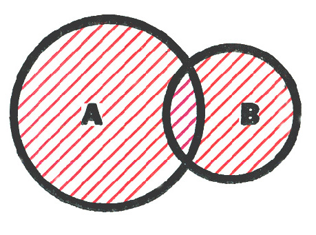 并集為下圖中的所有紅色部分,即為A和B的全部: