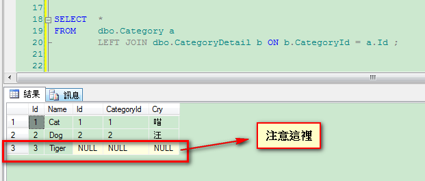 根據這圖和上面的比較可看出,這個返回結果只有兩個,Category 表中的Tiger的信息沒有帶出來,因為在CategoryDetail 表中沒有對應的明細.