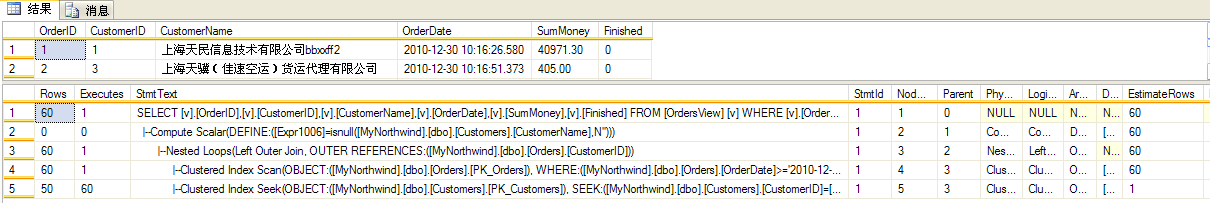 第2行:【Compute Scalar(DEFINE:([Expr1006]=isnull([MyNorthwind].[dbo].[Customers].[CustomerName],N'')))】, 意思是說,要執行一個isnull()函數的調用。具體原因請參考本文前部分中給出視圖定義代碼。