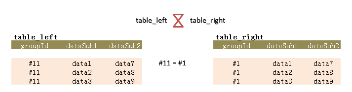 檢查表table_left的各組(groupId),是否在表table_right中存在有一組(groupId)數據(data)與它的數據(data)完全相等.