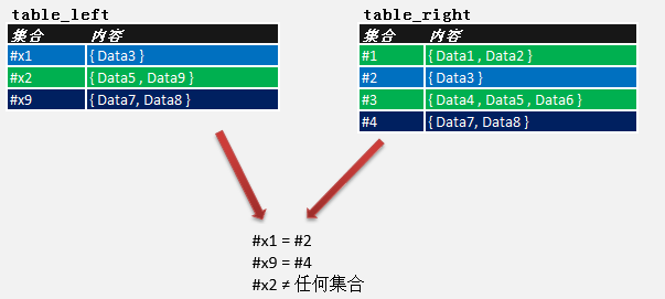 只要(#11 à #2 )或 (#2 à #11 )的"Except"集運算結果有記錄,就說明兩組的數據不相等。