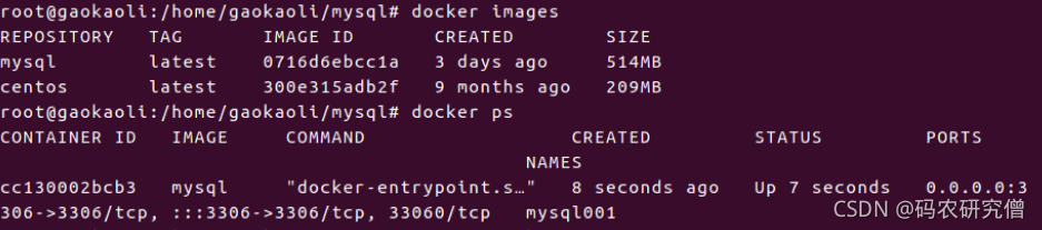 docker run -d -p 3306:3306 -v /home/gaokaoli/mysql/conf:/etc/mysql/conf.d -v /home/gaokaoli/mysql/data:/var/lib/mysql -e MYSQL_ROOT_PASSWORD=12345678 --name mysql001 mysql