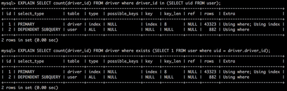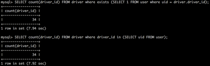 select `northwind`.`driver`.`driver_id` AS `driver_id` from `northwind`.`driver` where in_optimizer>(`northwind`.`driver`.`driver_id`,exists>(select 1 from `northwind`.`user` where ((`northwind`.`user`.`uid` = `northwind`.`driver`.`driver_id`) and (cache>(`northwind`.`driver`.`driver_id`) = `northwind`.`driver`.`driver_id`))))