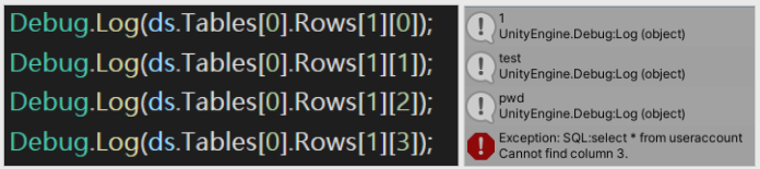 Debug.Log(ds.Tables[0].Rows[0][3]);