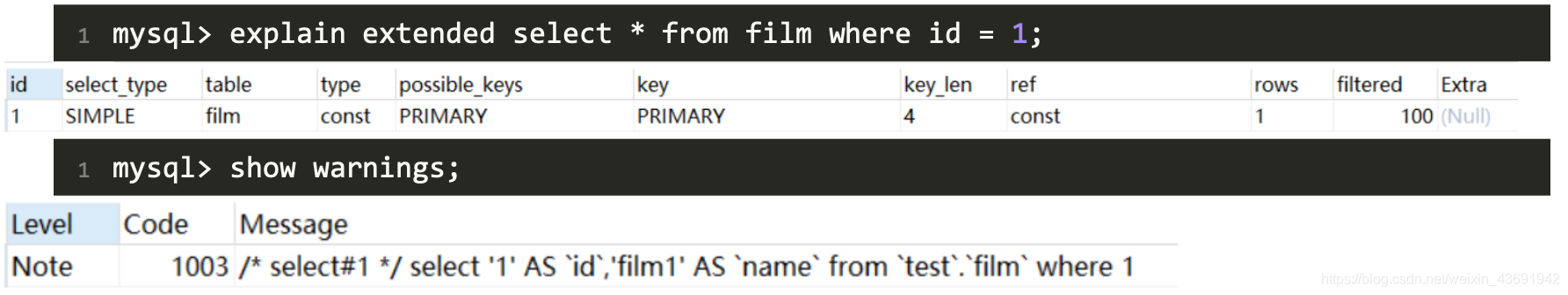 1)explain extended:會在 explain 的基礎上額外提供一些查詢優化的信息。緊隨其后通過 show warnings 命令可