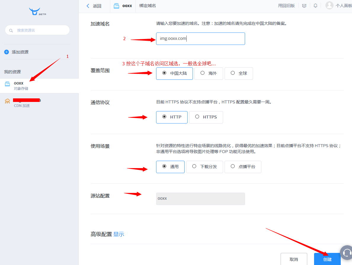 4.創(chuàng)建好后,就會(huì)在側(cè)邊欄“我的資源”顯示出來(lái),如樣例中的是 ooxx(對(duì)象存儲(chǔ)),點(diǎn)擊它,然后參照下圖綁定域名(提示:不綁定也可以,可以用七牛提供的3級(jí)域名)