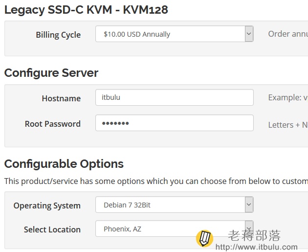 這里我們需要設置主機名(隨意)、ROOT密碼、默認安裝系統(隨便選擇一個)、機房(有鳳凰城和達拉斯)。