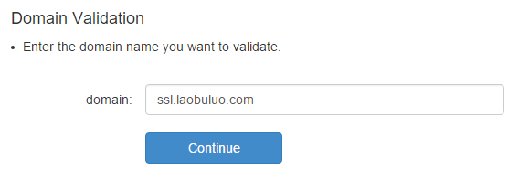 這里小編僅僅是為了測試StartSSL免費(fèi)SSL證書的申請過程,也沒有準(zhǔn)備用到實際的網(wǎng)站中,所以暫且用laobuluo.com其中一個二級域名作為申請證書測試。