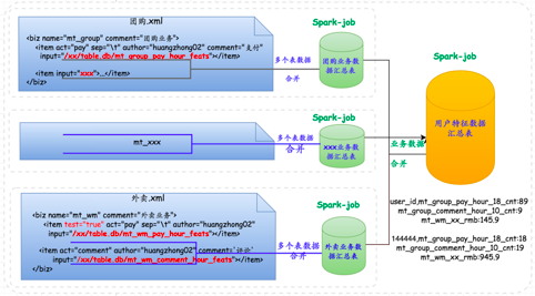 在圖中,我們可以看到特征聚合分兩層,第一層是各個業務數據內部聚合,比如團購的數據配置文件中會有很多的團購特征、購買、瀏覽等分散在不同的表中,每個業務都會有獨立的Spark任務來完成聚合,構成一個用戶團購特征表;特征聚合是一個典型的join任務,對比MapReduce性能提升了10倍左右。第二層是把各個業務表數據再進行一次聚合,生成最終的用戶特征數據表。
