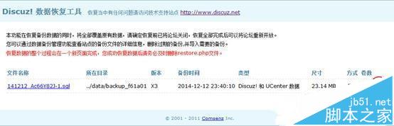 18、恢復(fù)數(shù)據(jù)前請在 Discuz! 安裝文件目錄下utility文件夾內(nèi)找到 restore.php 文件,然后將 restore.php 文件上傳到程序文件夾data目錄下。為了您站點的安全,成功恢復(fù)數(shù)據(jù)后請務(wù)必及時刪除 restore.php 文件。(我們可以重新下載一個全新的DZ然后上傳需要的文件)