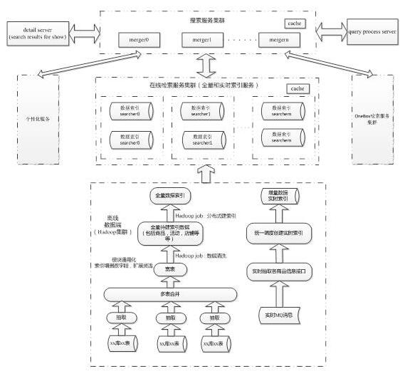 在線檢索服務集群:由很多個searcher節點組成,每個searcher列對應一個小分片索引(包含全量數據和實時增量數據)。