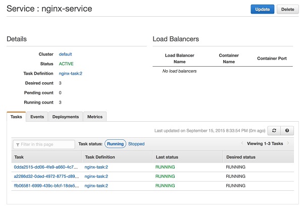 除了任務之外,服務是ECS概念中排名第二重要的。一個服務是給定一個任務所請求運行的特定的實例數(shù)量。舉例來說,如果我們有一個如上述所定義的運行nginx web服務容器的任務的話,我們則要定義一個服務,來請求3個或更多的實例組成集群,從而完成web服務的任務。