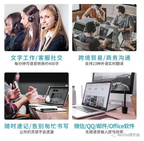 麥爾迪(MAIRDI)創新研發黑科技,第一次將AI語音技術與UC耳機結合。實現語音轉寫文字(每分鐘400字輸入),23國語音翻譯,多種方言識別。極大提高辦公效率,可應用于客服、跨境貿易、辦公通訊等應用場景。